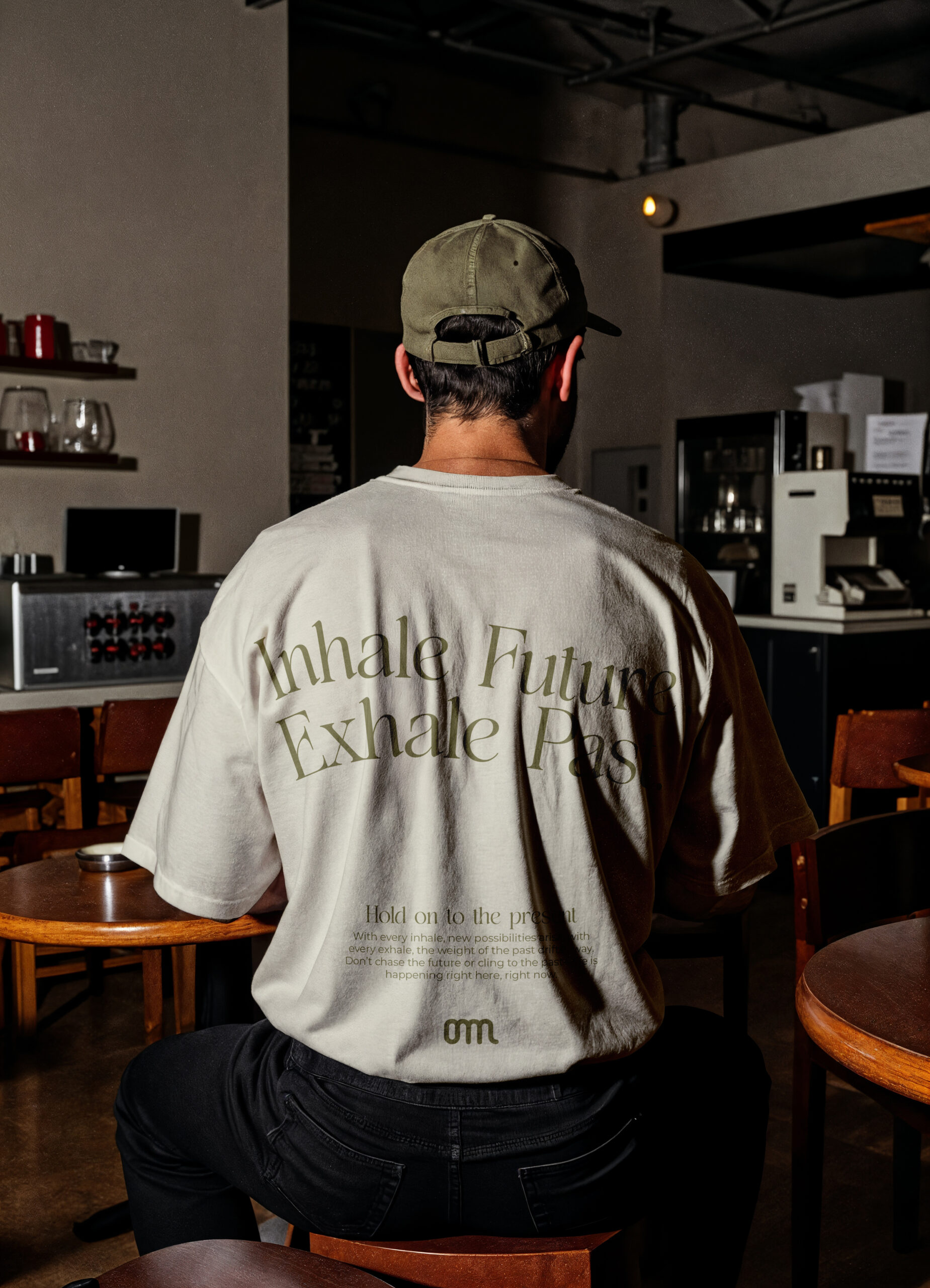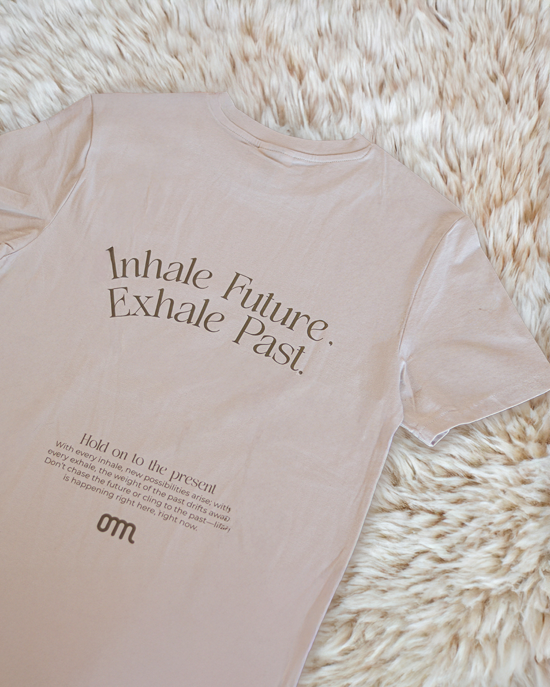 La camiseta beige OM meditación está pensada para quienes desean vestir con calma, comodidad y un toque de inspiración diaria. En tono beige suave y con un delicado estampado verde oliva, transmite el mensaje “Inhale future, exhale past – Hold on to the present”. Un recordatorio constante de que la vida sucede aquí y ahora.